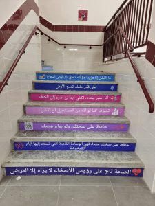 تعزيزا للصحة والرياضة قامت المدرسة بإعداد ملصقات بعبارات تشجيعية وتحفيزية مع رمز شريطيّ يحتوي على العديد من الفعاليات ومواقع الانترنت التي من شأنها مساعدة الطلاب علقت على درج المدرسة.